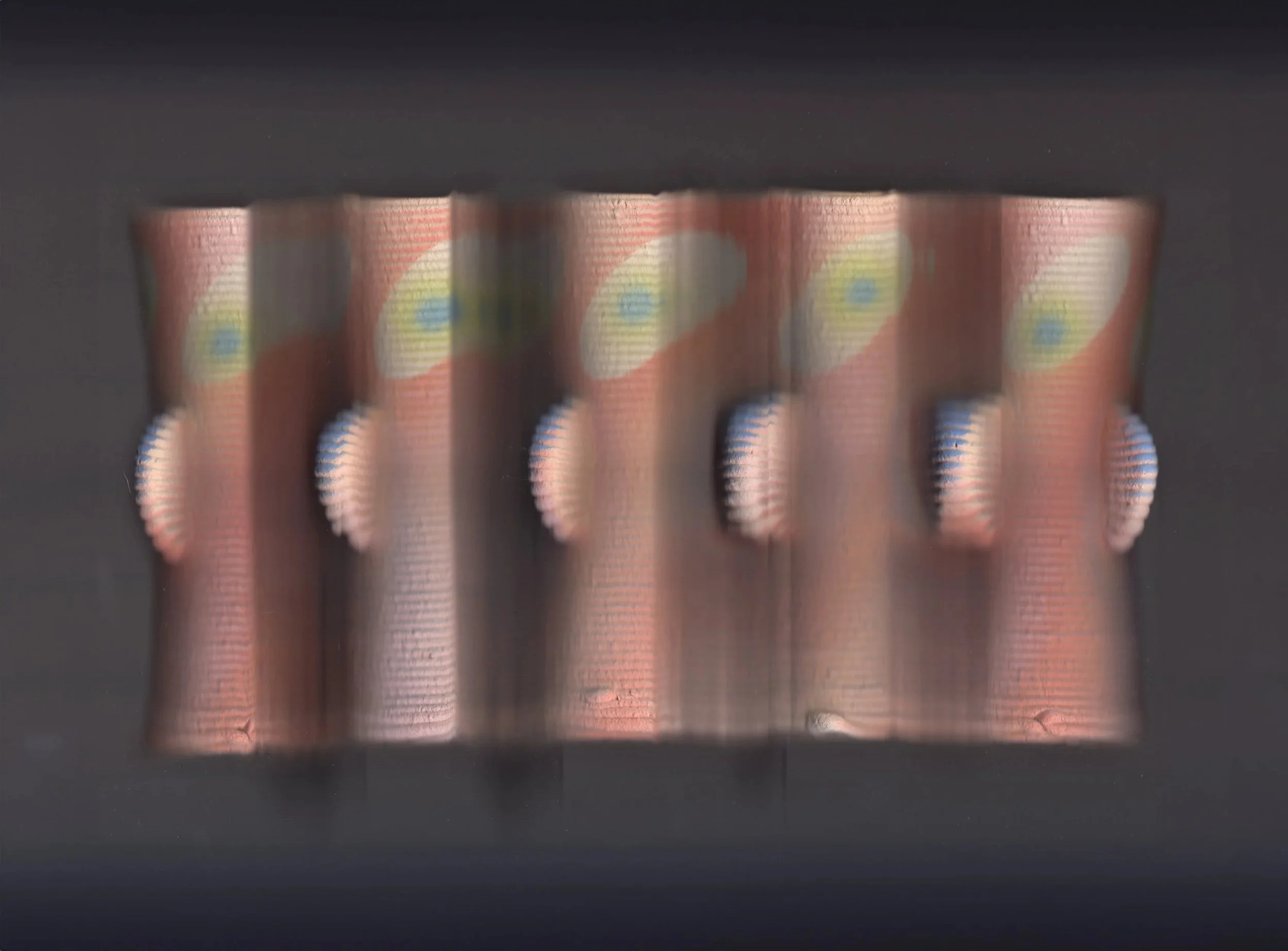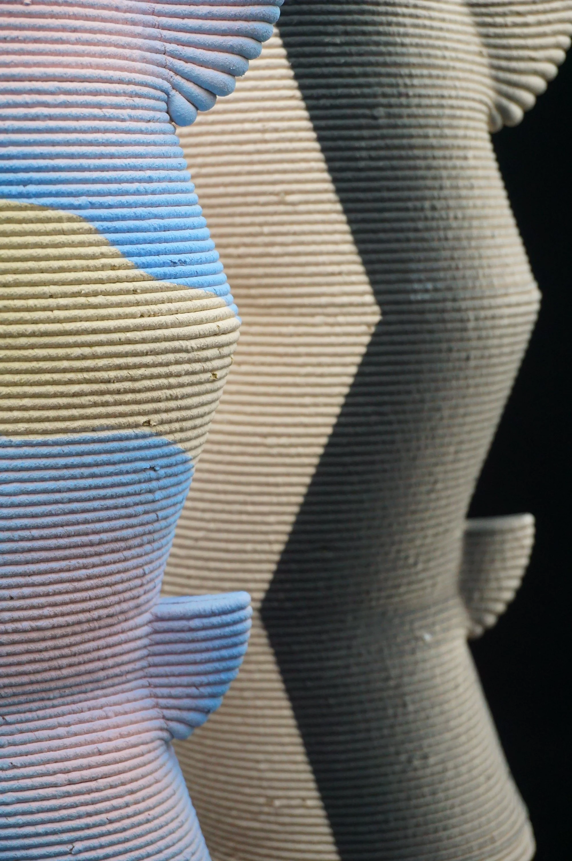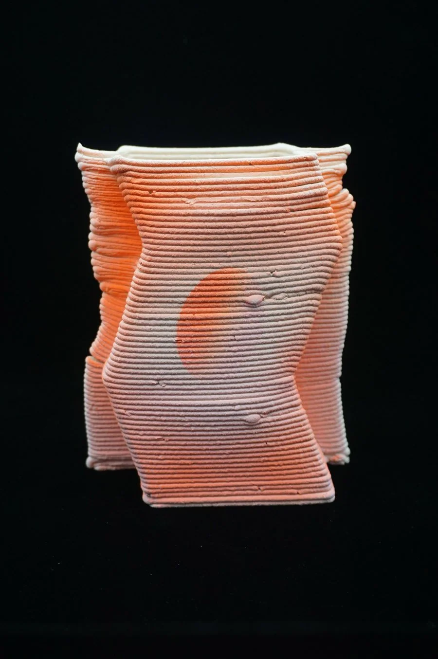 Using form, texture and color, this bespoke 3D-printed clay capsule is the artist’s inaugural exploration into this new technology. She continues her practice of airbrush techniques, layering colors, playing with negative space and using the repetitive lines of the printed clay to her advantage.