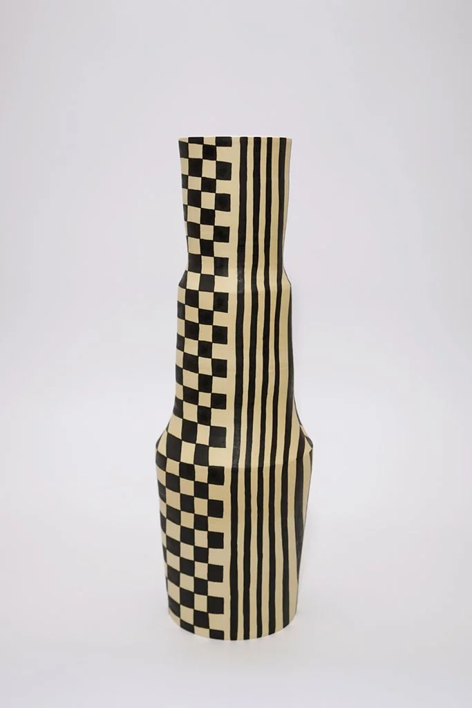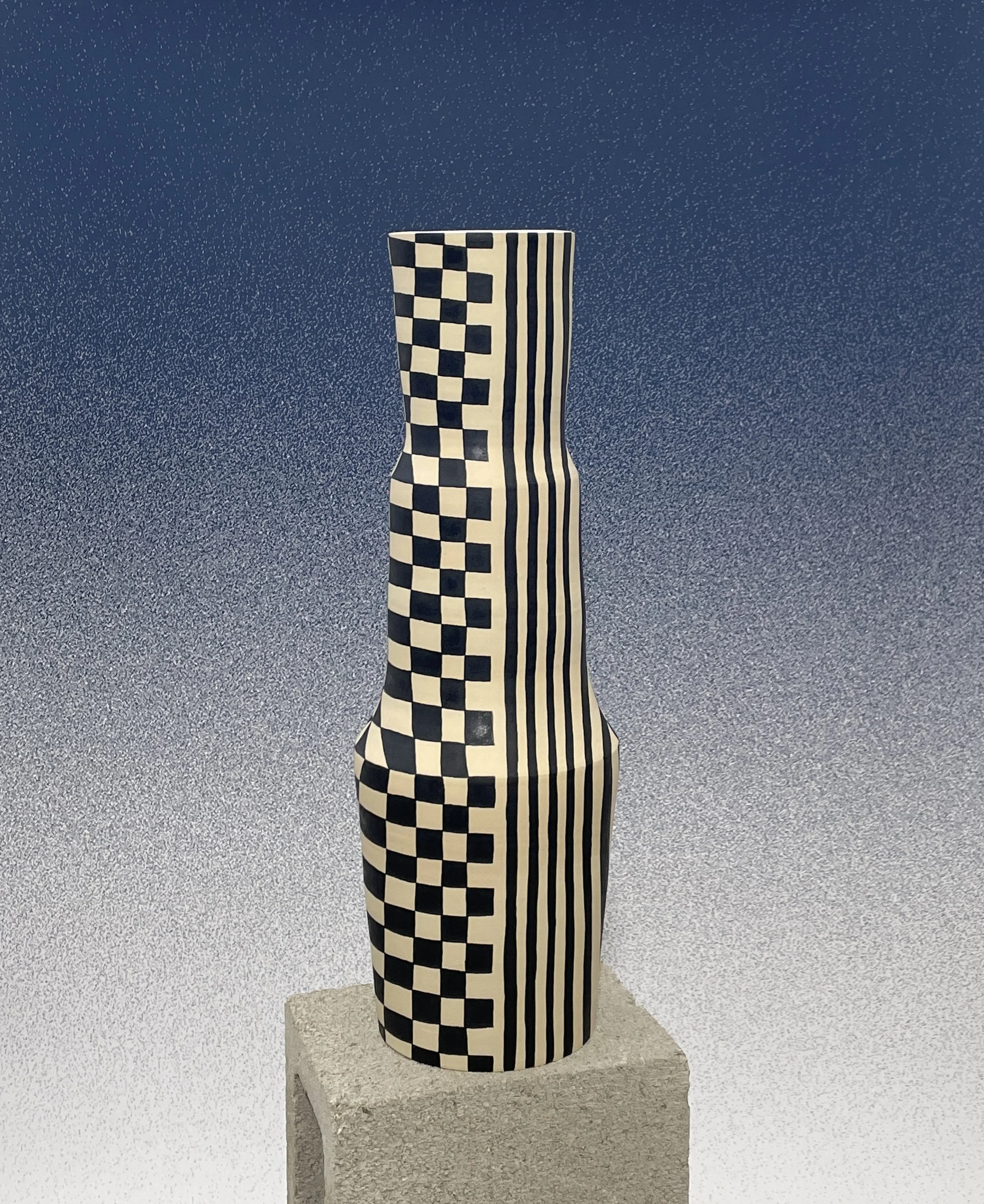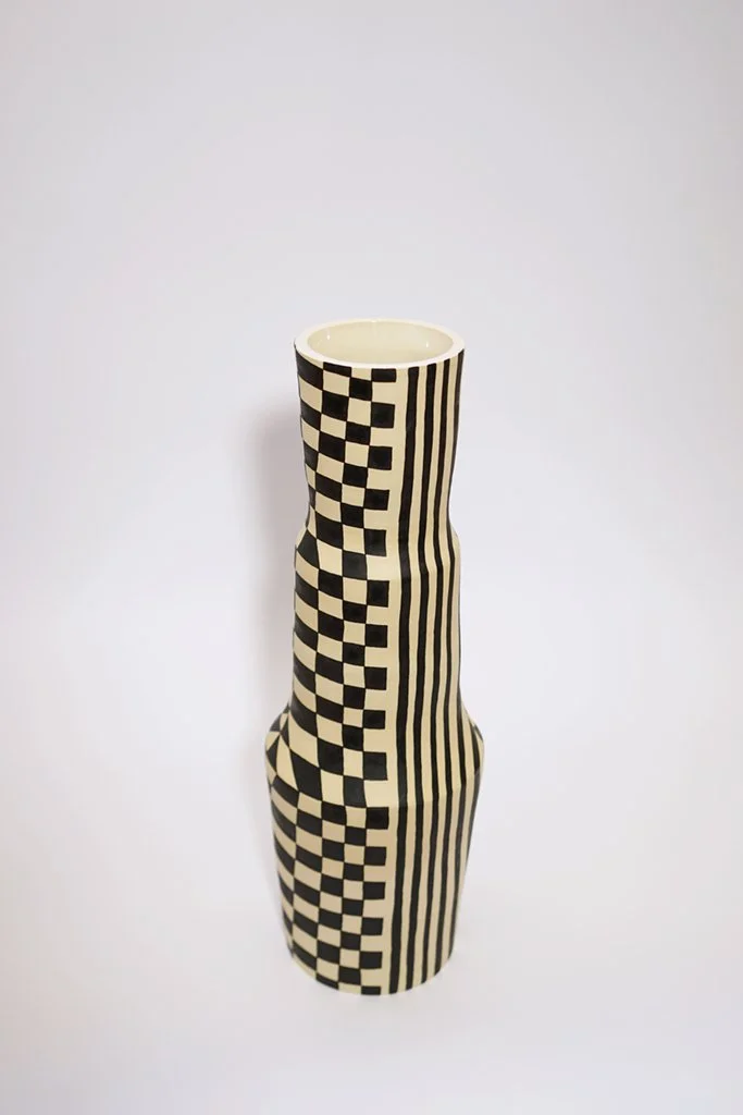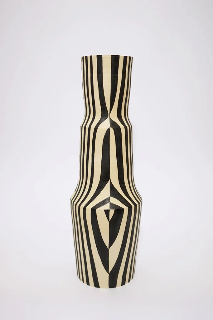 Optical Delusion is an dive on optical art and how flat, simple shapes are manipulated on a 3 dimensional vessel. As the shapes move around the curved vessel, they wrap into something new as they move and join toward the center of the vessel.